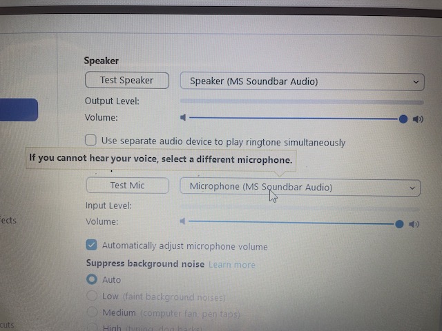 Going back to the upper left area, click on the “Audio” option. Next to the “Test Speaker” and “Test Mic” buttons, select the “Speaker (MS Soundbar Audio)” and the “Microphone (MS Soundbar Audio)”.