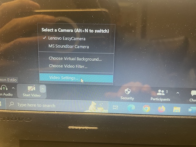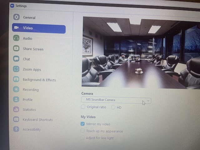 In the “Settings” section, near the upper corner, click on the “Video” option. Near the middle where it says, “Camera” make sure it is set to “MS Soundbar Camera”